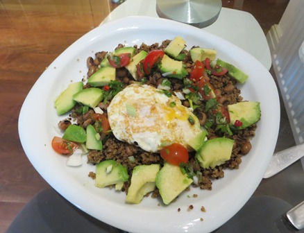 We got home, had a bath and then the muchies set in. We had what is billed as a South American brunch to try and re-fuel (get me – running lingo!) and help with recovery. It’s basically a fried egg served on quinoa and back eyed beans topped with avocado and a spring onion and tomato dressing. The recipe is originally Jamie Oliver and we haven’t made too many changes to it really. We use packet quinoa which can just be done in the microwave in 45 seconds and usually a tin of black eyed beans but other beans will do. We don’t add any salt and we don’t add chilli sauce. It’s delicious and it looks like this: