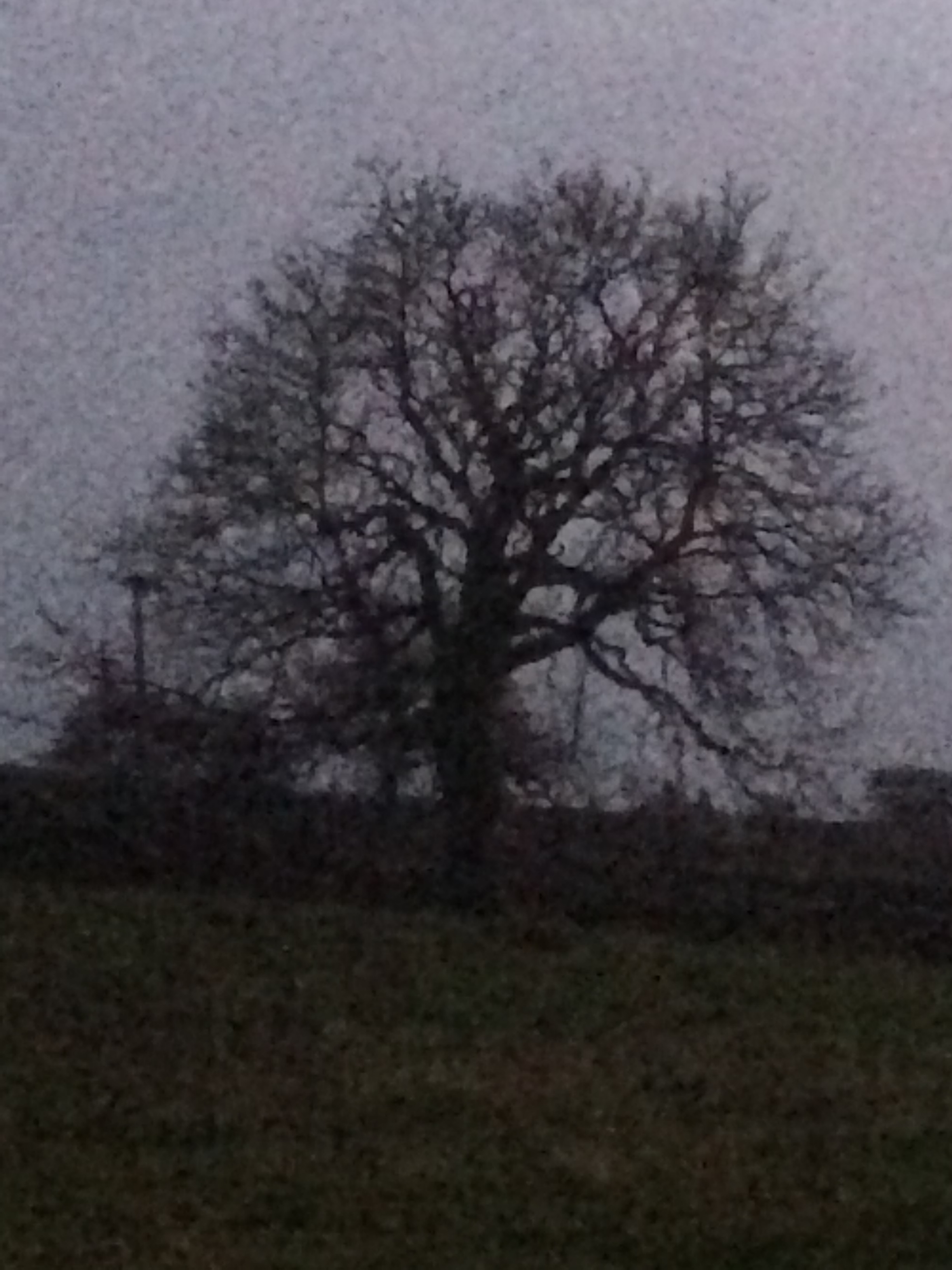We walked up the former golf course and stopped for a Christmas morning kiss half way up the first slope. As we were about to carry on we heard deer off to one side – we saw a hint of movement but nothing more. We walked on up and then through the wood and stopped briefly when our favourite tree came into view.