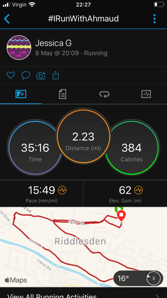 I was thinking about #IRunWithMaud all day, for the last few days really. I wondered why I hadn’t heard more about his murder, why this was not on my radar, why it took until the end of April for me to really know about this. I wondered what running 2.23 miles today really means and I wondered that in the context of VE Day, clapping for the NHS and a national feel where virtue signalling increasingly is everything but means nothing. I thought about the many people who yesterday stood on their doorsteps clapping the NHS and today abandoned social distancing to have weird nostalgic and to me rather sinister street parties to celebrate some weird notion of the end of a war they mostly know nothing about.