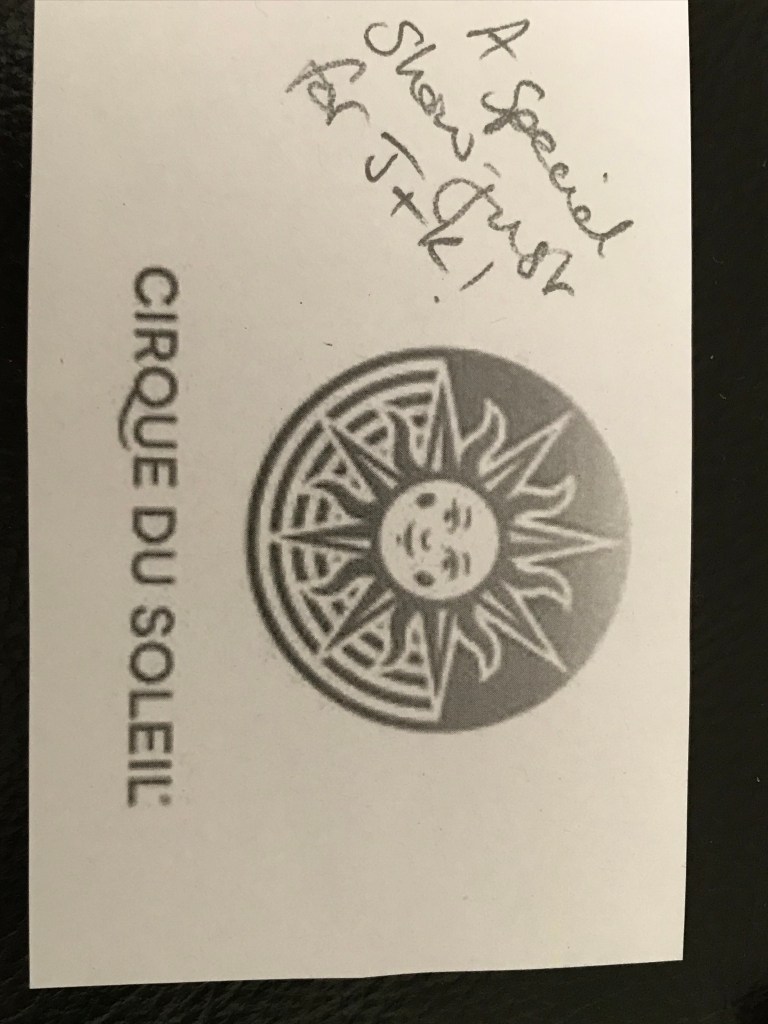Then it was time for an early evening (no alcohol) mojito and a one hour Cirque Du Soleil show with absolutely the best seats in the house (our sofa).