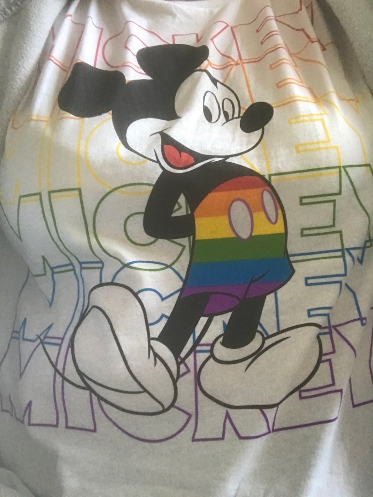 I still didn’t really know what was coming or what to expect from a virtual Disney Day. Back home we got sorted and for the first time in weeks I thought I would take a little care over getting dressed rather than just grab a pair of tracksuit bottoms and the nearest t-shirt. Just as I was about to attack the wardrobe to find something suitable, Kath told me that she had taken the liberty of doing some shopping so I’d have a suitable outfit and handed me a little package. I unpacked and pulled on my brand new Mickey Pride T-shirt with pair of jeans, put on my Tinkerbell necklace and popped in my Mickey earrings. Ready! We had breakfast of Mickey Ears shaped pancakes and fruit while we watched the sunrise at the Animal Kingdom. The thing with a virtual Disney Day is that you can do things on the same day that wouldn’t be possible in one day if you were actually there! We also played with our own little Stitch (Odin) and tried to stop him from escaping and causing havoc.