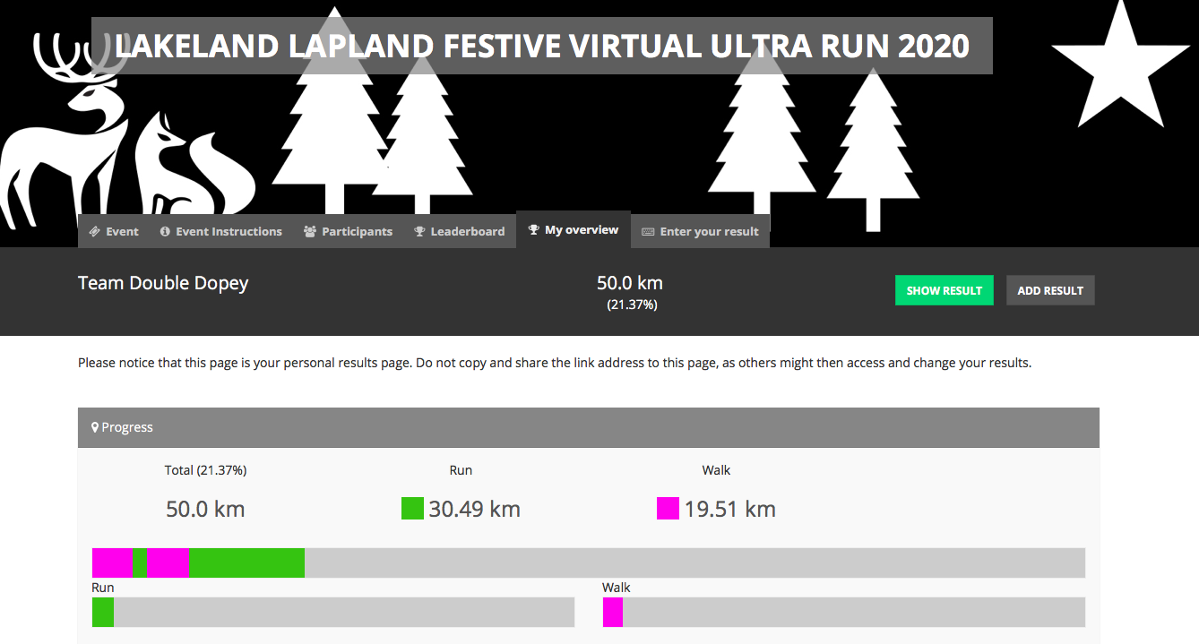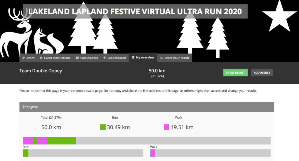 A run today certainly would have been, erm, let’s say bracing and actually if fitter I might have quite enjoyed a relatively speedy sheep loop followed by a shower and lounging in front of the fire. But I am not fit and speedy isn’t an option at the moment. But just staying in wasn’t an option either because Kath and I are doing the Lakeland Lapland Festive Virtual Ultra. It started on 7pm on the 10th and runs to the 22nd December and in that time we need to cover a total of 234km between us as Team Double Dopey. It works out at 9.75km each every day for 12 days (with the cushion of a 13th day if we need it because of the activity upload window they allow). My plan was always to walk mostly as I really wasn’t sure how I would be doing at this point. The plan was also for Kath to cover most of the distance and me to contribute as much as I can. And that is pretty much how it is working out.