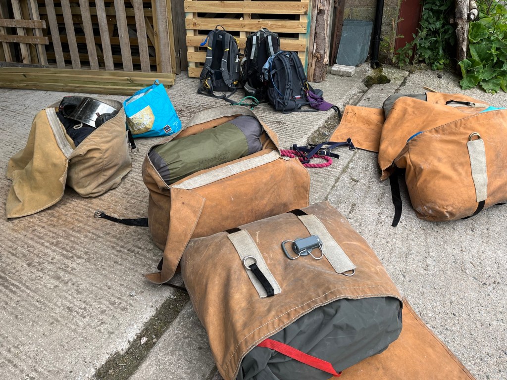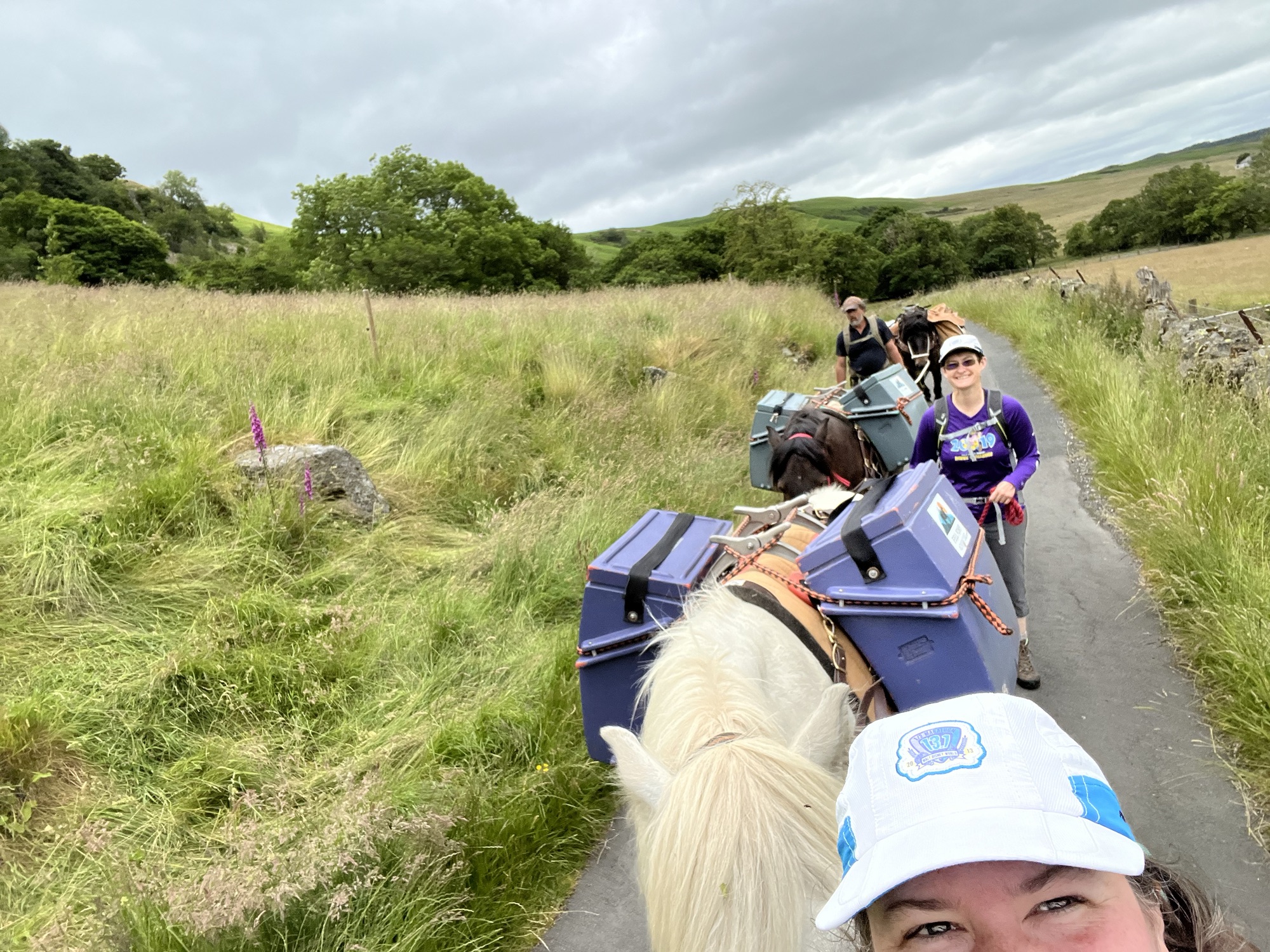 After breakfast of bacon and eggs on a warmed croissant we started packing all the gear and getting it into the pack pony bags with Tom carefully weighing them to make sure we got even pairs for each pony. Then we got the ponies. Tom and Mountain Leader Sue had suggested who takes which pony and it worked really well. So Kath took Pansy and I took Prince. Tom showed us how to put the saddles on the ponies and then how to lift the packs on and then, after a quick ‘this is how you lead a pack pony induction’, we were off.