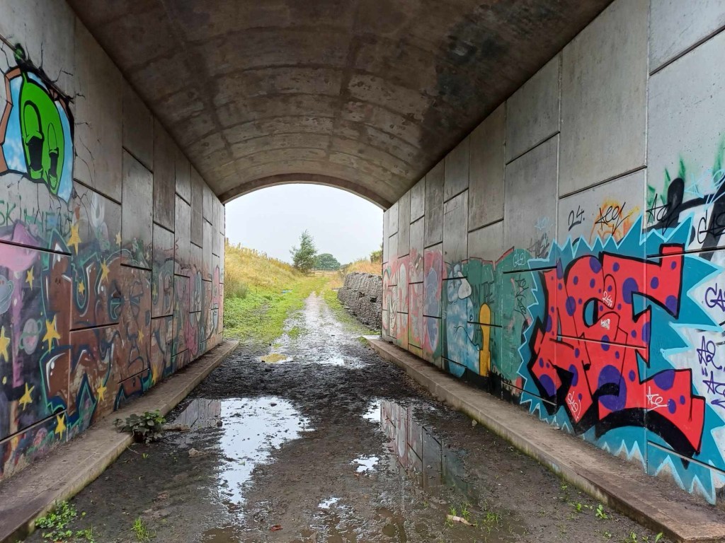 A brief nod to Drumburgh Castle and we were on the Burgh Marshes. That’s a roughly 3 mile stretch which we walked part on the road and part up on the grassy mound. We could still hear and see curlews and lapwings. Once we crossed the cattle grid at the end of the marshes, we were heading into Burgh-by-Sands. Our taxi driver had told us that the Pub there was pretty much the only thing open for refreshments along the route and that it opened at 12. It was only 11.30 so no coffee and pee stop. It was raining quite heavily and as we continued on I got completely drenched by a car driving through a puddle. I lost my sense of humour for a few minutes and am marched on with soggy knickers.