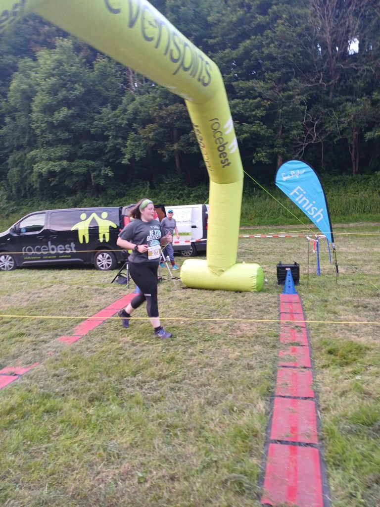 The support was incredible but also overwhelming and at times it felt like the crowds were closing in. I had flashbacks to the London Marathon and people getting right in my face and I could feel panic rising. What can I feel? Sticky – my fingers are sticky from my drinks bottle. What can I see – a unicorn, a runner in a unicorn costume just ahead of me. What can I hear – my name being shouted with lots of encouragement. And I am grounded again for a little while before the panic comes again – in waves. I don’t feel like I belong. I am still running 30 seconds and walking 30 seconds. It is all actually going to plan. It’s all fine and yet it isn’t. I battle the panic from just over 1.5 miles to the 5 mile marker. I am walking much more now and I can’t quite settle. I do the maths in my head – how long will I be out here, how much longer to get to the finish, how long will Kath have to wait. I resist the temptation to check the app to see how she is doing. If I get my phone out of my pocket I might call her to say I am calling it. I might cry. I am crying. I think about maybe just not doing this.