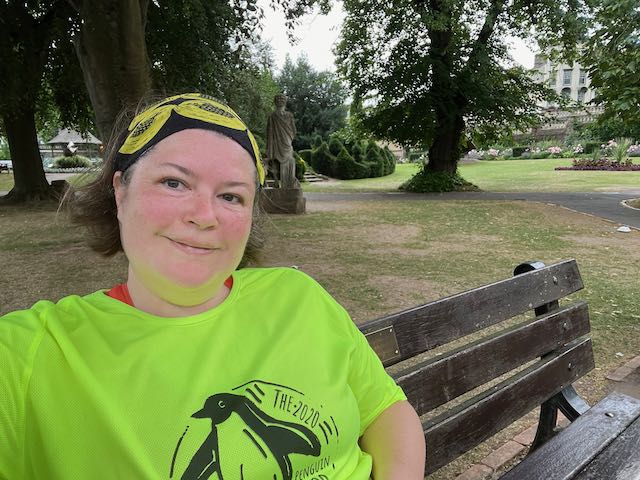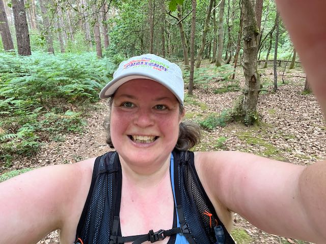Kath caught me at an aid station, she was struggling so my focus shifted from me to encouraging her. I had some water and coke and carried on leaving Kath to go to the loo. When she came past me again she looked much stronger and seemed happier. All good. The route was nice – woodland paths, some sand, a lot of shade which was so welcome in the ridiculous heat. Part of the reasoning for this run had been to practice fuelling so I had apricots as well as some haribo and tailwind in both flasks. If I was to get anywhere near the recommended amount of carbs, I’d needed to drink a flask an hour and have several apricots. The haribo were emergency fuel. I was doing ok-ish on the drinking but really struggled eating so gave up on that. When I had nearly finished one flask I wanted to replenish my tailwind at the next water station but I couldn’t get my stick pack open. It just wouldn’t tear. So I gave up in that in a huff and just filled the flask with water and got myself round on that and flat coke from the aid stations. I thought I might like the little pretzels and other things they had but I didn’t want proper food. Not even the haribo. I should of course have just asked for help to get the stick pack open. I honestly just didn’t think of that on the day.