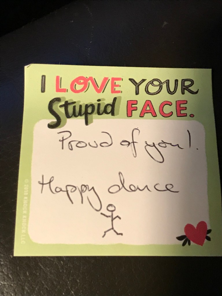 Kath caught me up just a minute or two after I had finished and was walking home. We walked together a few minutes and then she set off the run the last bit. When I got home this was stuck on the door and it made me giggle – although I had no energy for a happy dance just then.