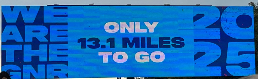 I wonder if I can get to half way. My right foot hurts, my hips hurt, I keep scanning my body and the message is always the same – there is some pain but none of it is serious and none of it is a reason to stop. Mile 6 feels like it takes forever. It was actually faster than the previous mile. As I pass 10k I suddenly feel a bit more positive. Maybe there is a slight break in the crowds coming past me. I’m not sure. I just feel less anxious. I start to take more notice of the signs and the support. I start to feel a bit more like it is ok for me to take up some space. A bloke from 2 waves behind me walks along side me for a few paces to fuel, asking if we are nearly there yet and I cheer him up by telling him we are very nearly half way. He tells me I am doing great and then disappears off into the distance. Somehow the interaction makes me smile. I realise that an earlier one had played on my mind – I had dropped into a walk and a bloke came past me, turned to look at me and said ‘For fuck sake’. I am pretty sure I didn’t block him. I am pretty sure I wasn’t in his way. I am pretty sure he didn’t have to change his line. I hope that taking out whatever was going on with him on me, helped him get it done, I also hope that he has a particularly energetic batch of fleas hatch in his pubes.