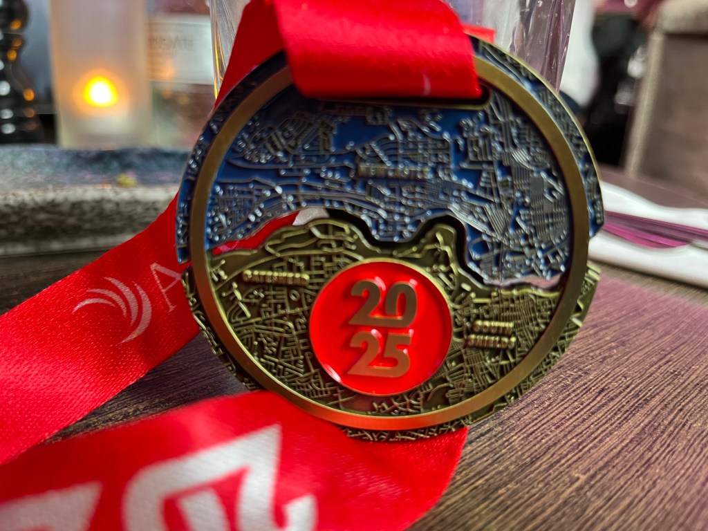 As I made my way down the short sharp slope before the ‘finishing straight’, two women passed me and one said to the other ‘now prepare yourself for the longest mile of your life’. And it is. You turn and it feels like you should be there but you still have a mile to go. The support is loud and brilliant. After an age I got to the 800 metres to go sign. I kept walking as fast as I could and talking to myself. Both firm and reassuring because giving up now would be stupid wouldn’t it. Never mind the longest mile – the 400 metres from the 800m to go to the 400m to go sign were at least 3 miles long. It felt like forever. I started jogging really slowly at the 400m sign. I glanced at my watch and realised that I would probably just get under 3 hours 40 if I kept pushing. I got there. I crossed the finish line and felt – well nothing really. I walked and got water, a medal and a bag/t-shirt and made my way through the crowds to find Kath (she did really well). We queued for an hour or so to get on a bus back into town and got back to the hotel about 10 minutes before our dinner reservation. Job done.