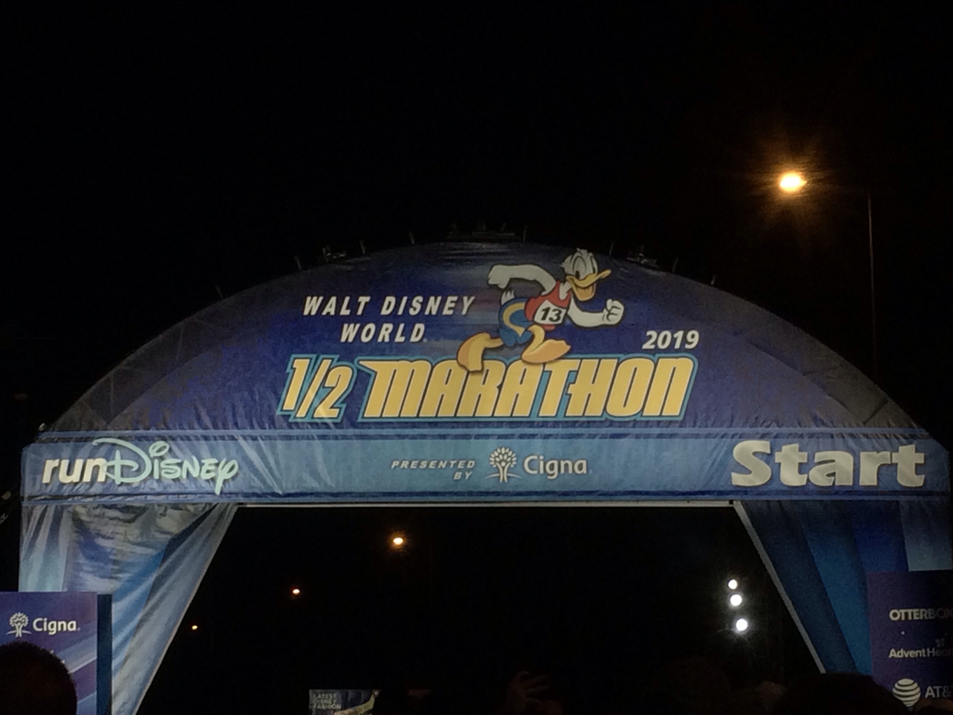 Anyway, we were both a bit of a mess but I think we both started feeling better once we got dressed and out the door. I’d not been too bad until runDisney had issued a weather advisory for warm and humid for the marathon day. That did not settle nerves and I was worrying about hydration and fuel and heat and and and. Still, we were doing this. in the lift we met a group of lads coming back from a night out and they were confused and impressed that we had been to bed and were heading to run. The little exchange with them lifted my spirits. We got on the monorail and to the Race Retreat tent. It was far too noisy. The music was really loud, there was nowhere quiet and it wasn’t really relaxing. We had our breakfast, went to the loo a couple of times, got organised and checked in our bags. Then we walked to the corral. F again for this one. I didn’t really feel any more settled.