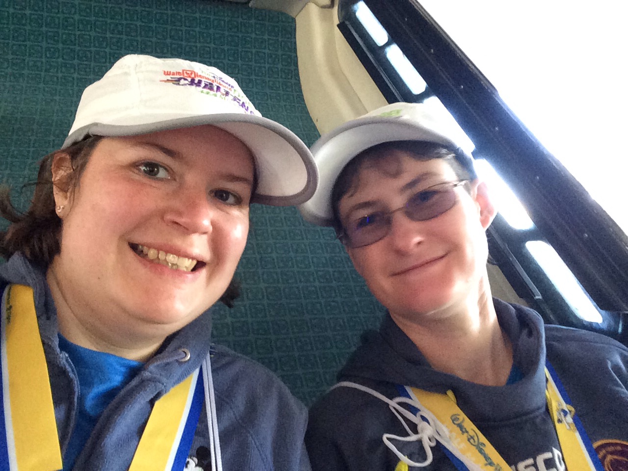 The last 5 miles are a bit of a blur. I remember seeing Hollywood studios. I remember running a bit through the park, the cheers of the crowd lifting me. I remember exiting and hitting the walkway between Studios and Epcot. I remember people encouraging us and telling us we were so close. I remember willing every muscle in my body to keep working. I remember the Boardwalk and I remember a slope onto a bridge that we did during the half too that had seemed like nothing. Now it seemed soooo hard. I heard Kath telling me to power up it. And then we jogged down. There were people with signs, signs that were making me cry. Everything was making me cry. I was in danger of being completely overwhelmed with about 2 miles to go.