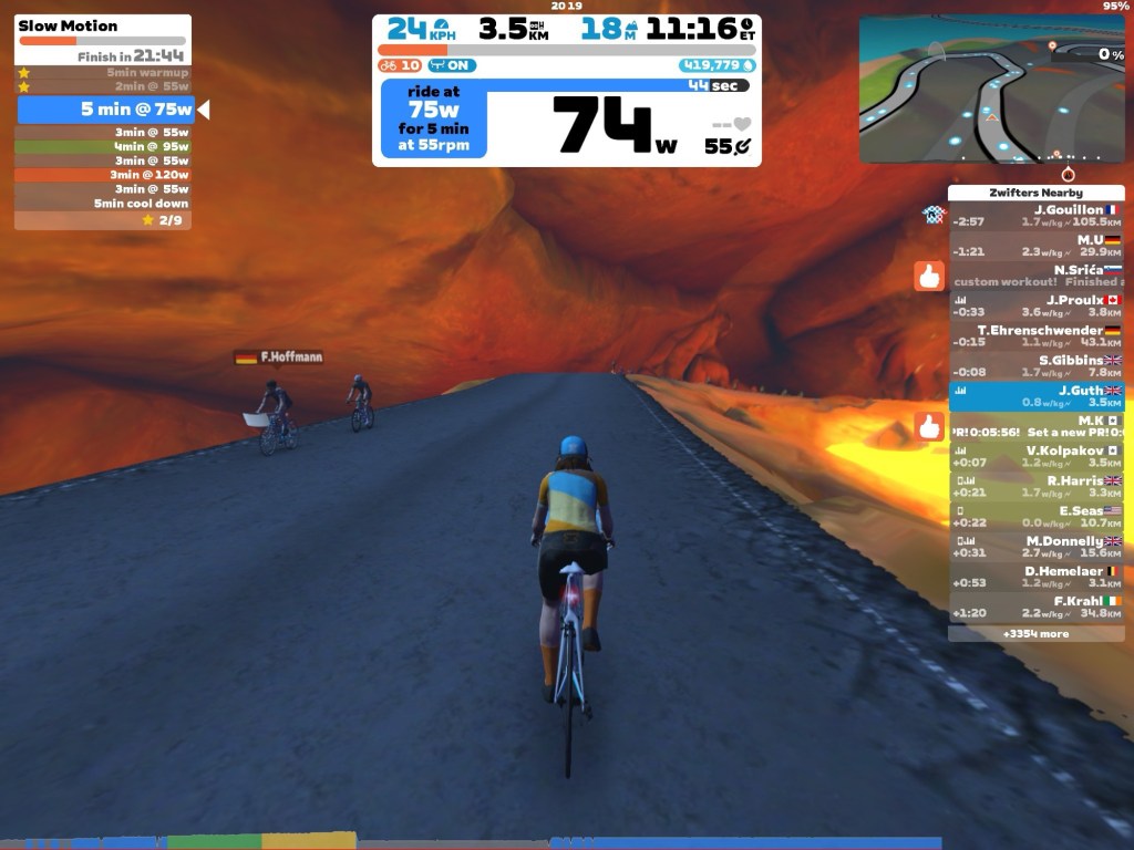 Since returning from Ambleside a couple of weeks ago, I am finally making progress. I have done the first 2 weeks, that’s 4 rides, of the very basic training programme in Zwift. I have actually enjoyed it but it’s clear that doing the ramp test while still recovering from COVID was a mistake. I need to re-do it as it’s making the sessions that rely on that measure too easy.